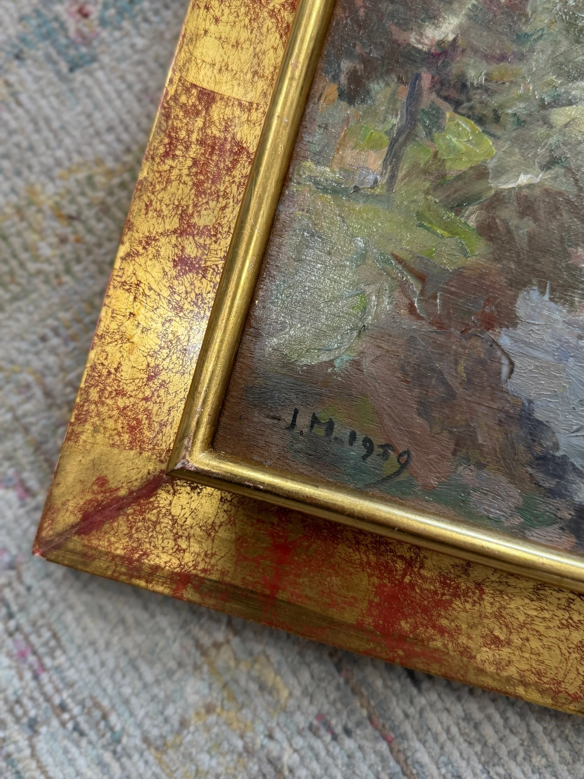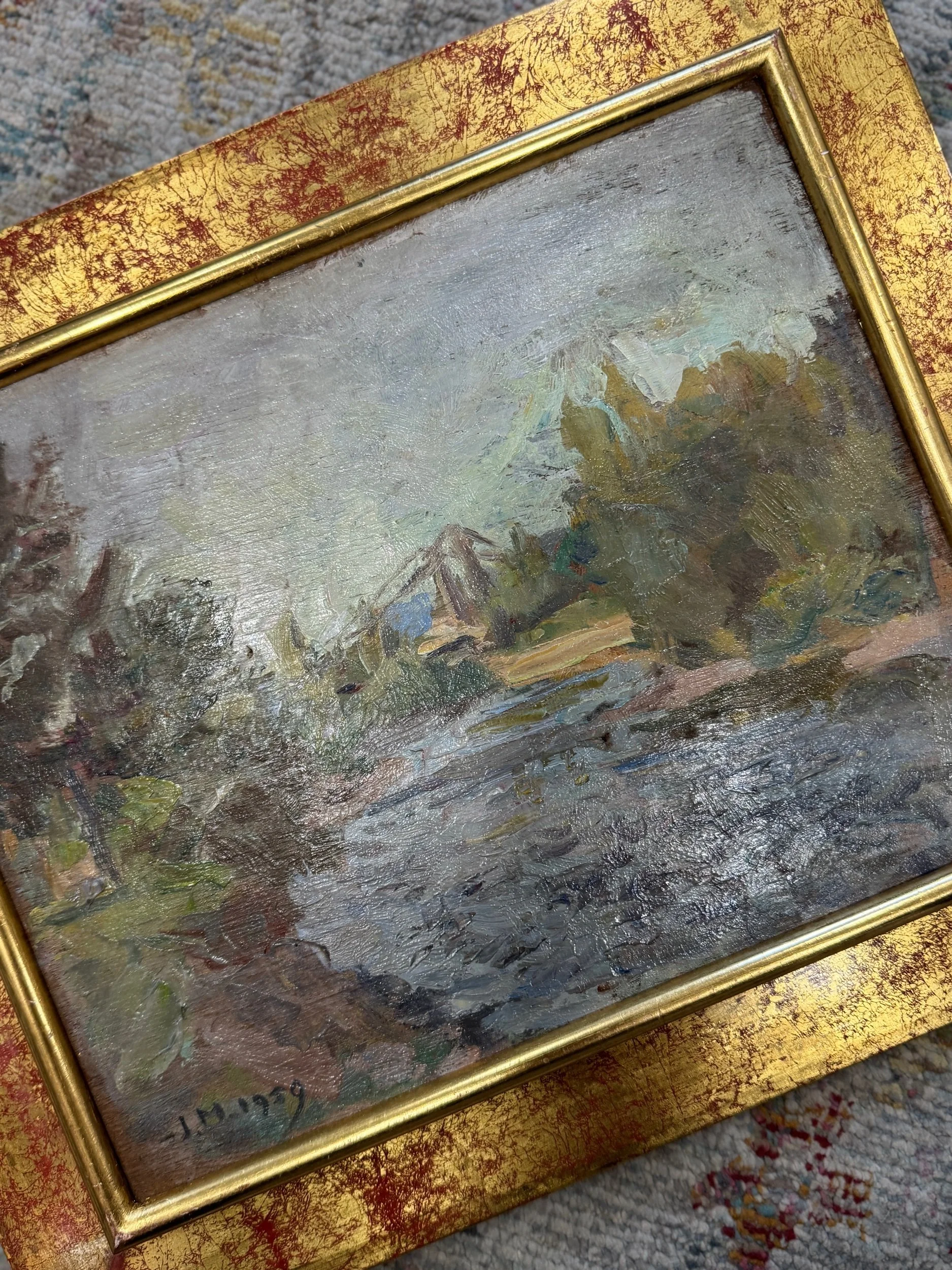 This French gorgeous pastel-hued signed oil painting featuring a classic landscape and river scene. The soft brush strokes are reminiscent of famous impressionist paintings. The two-tiered frame brings the painting forward and draws the eye even further. Perfect size for anywhere in your home.