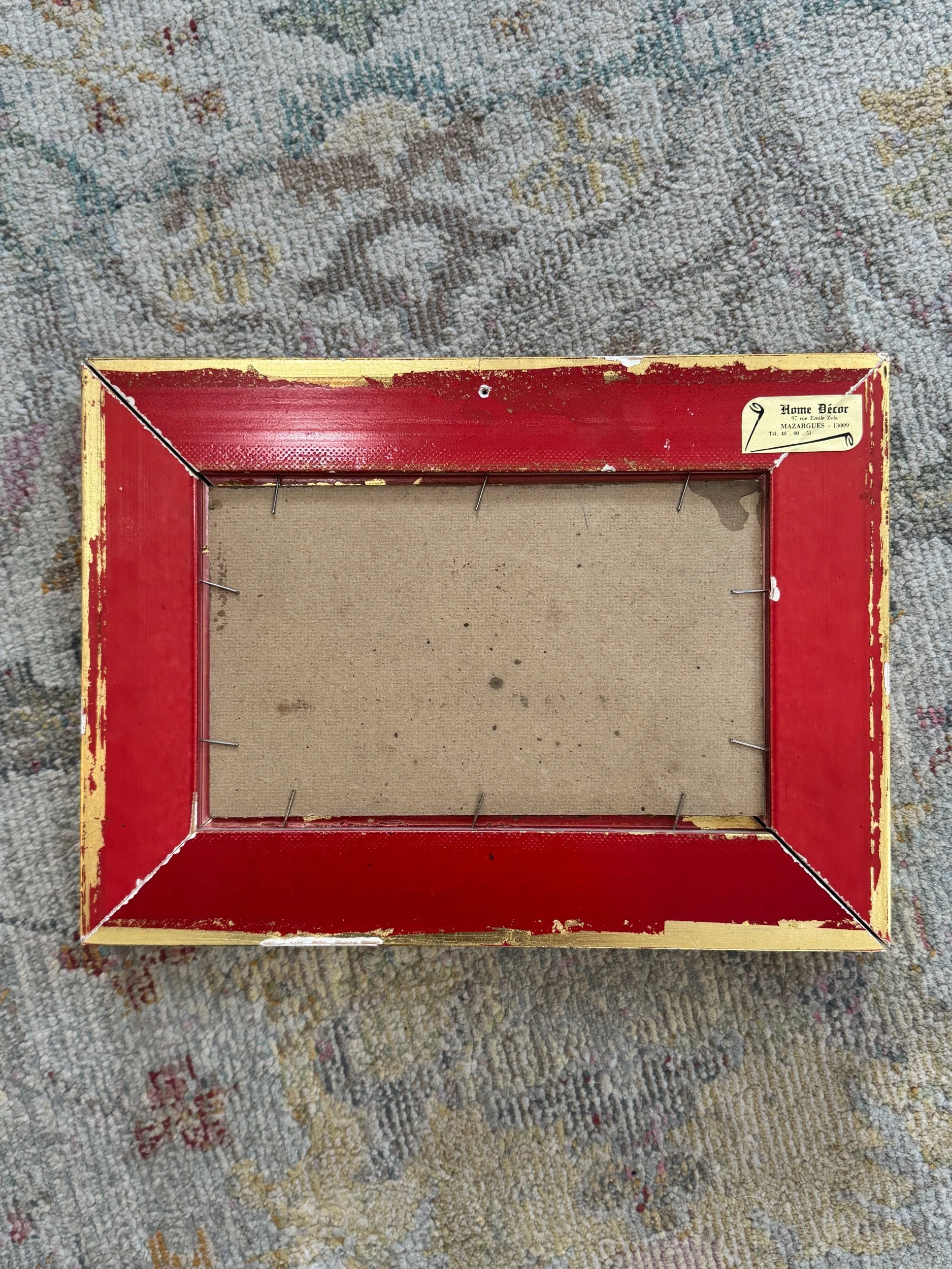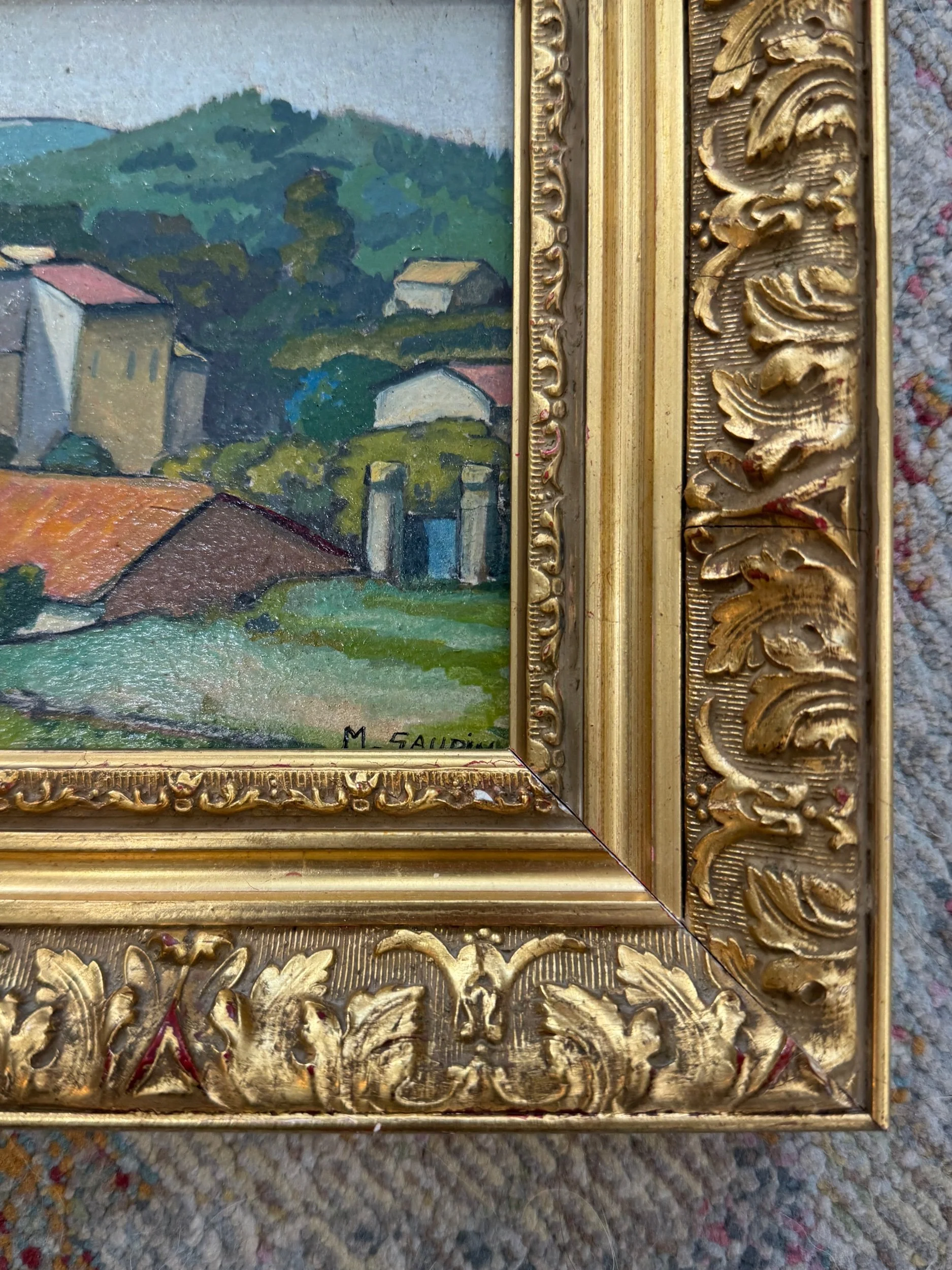 Featuring mountains in the distance and colorful rooftops in the classic Provençal palette. Perfect for a kitchen or anywhere that needs a pop of color. Frame is showing some splitting and damage in the corners, see photos.