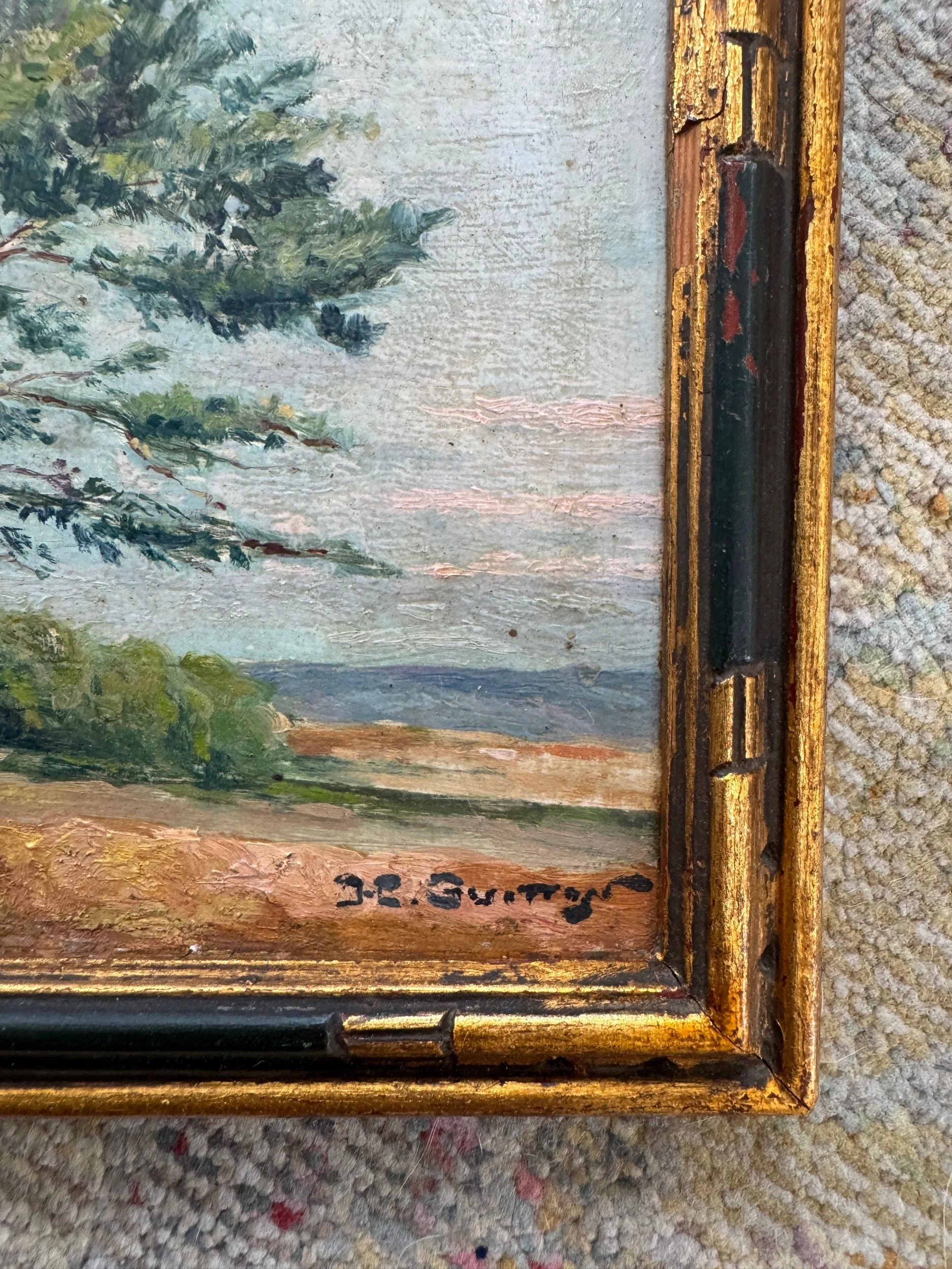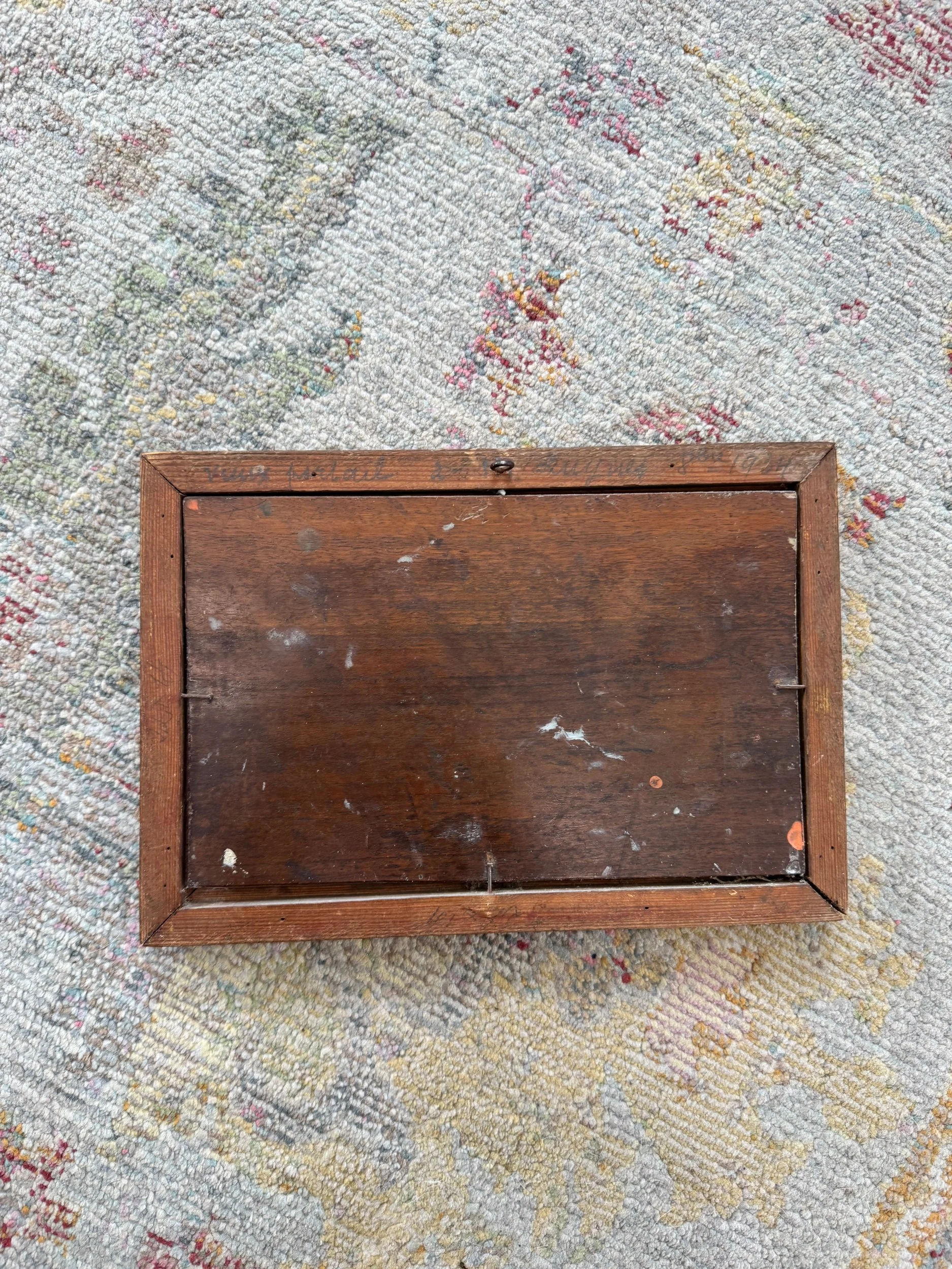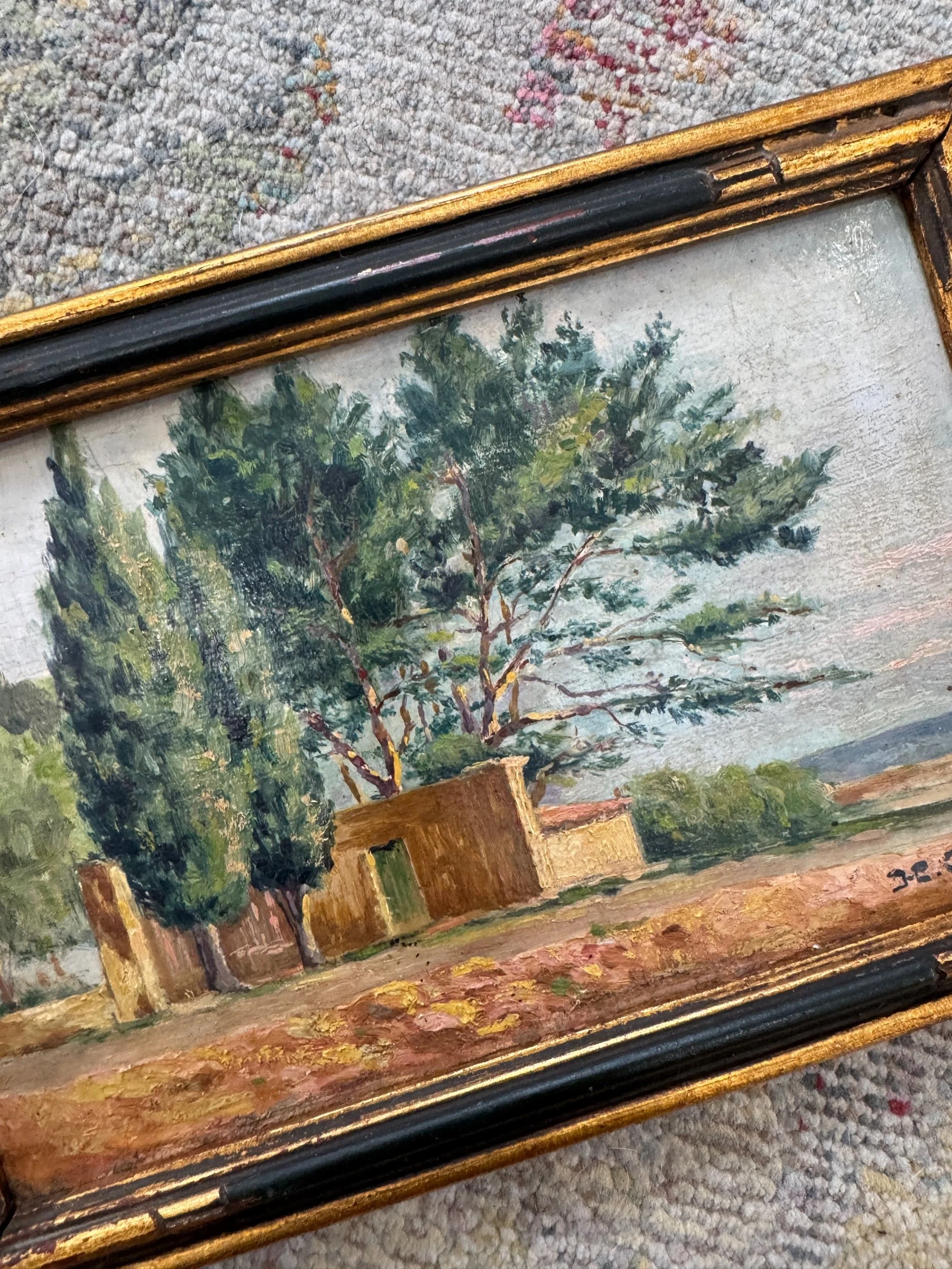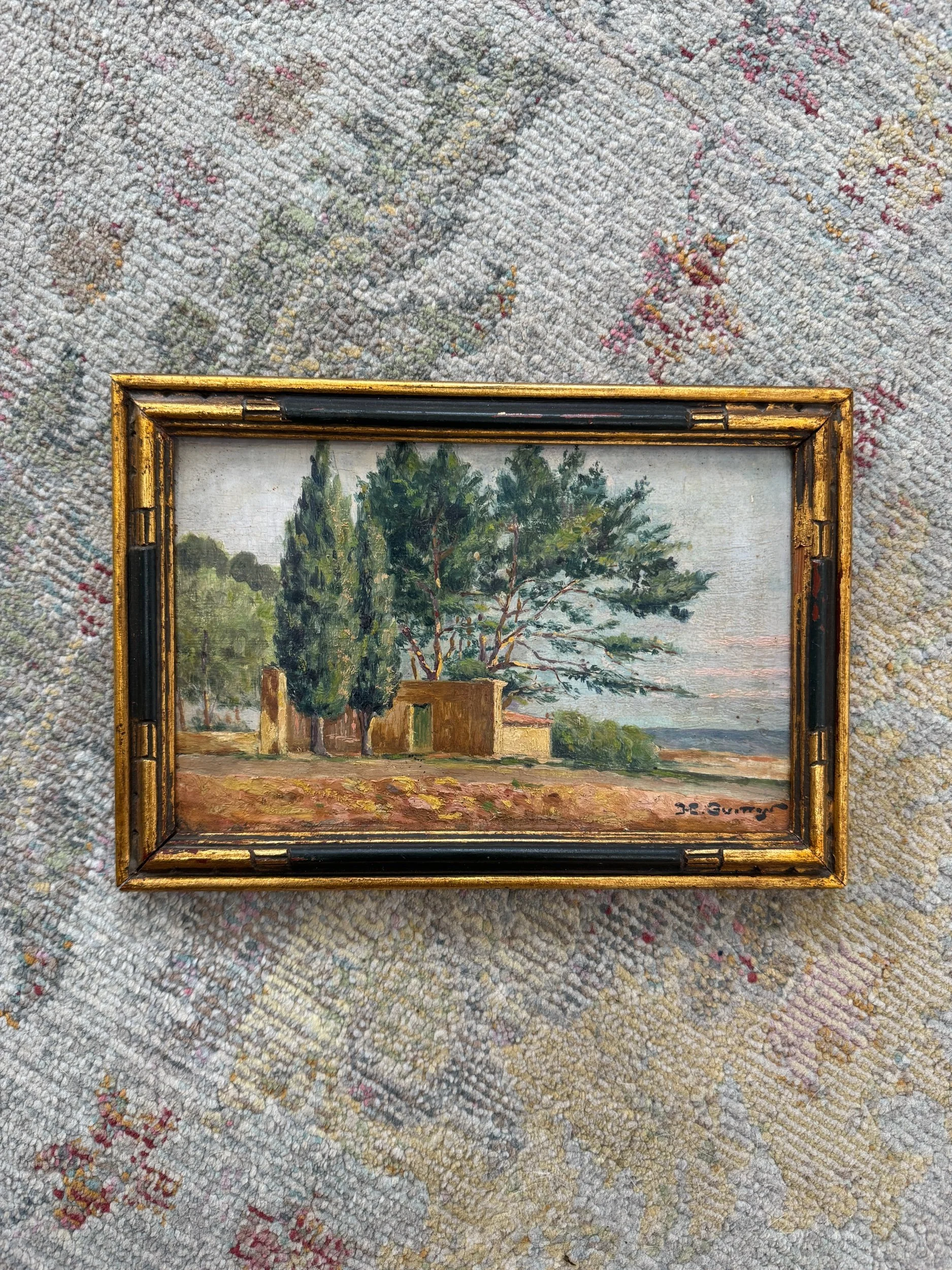 This oil painting on a wood board features beautiful cypress trees found all over Provence. Rich terracotta tones mixed with various greens make this painting feel classic, yet special. Piece is signed and framed in a black and gold. Perfect for layering or to put in a bookshelf.